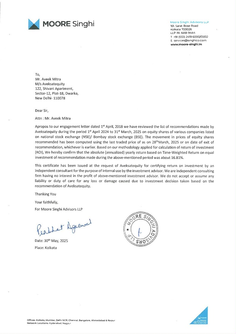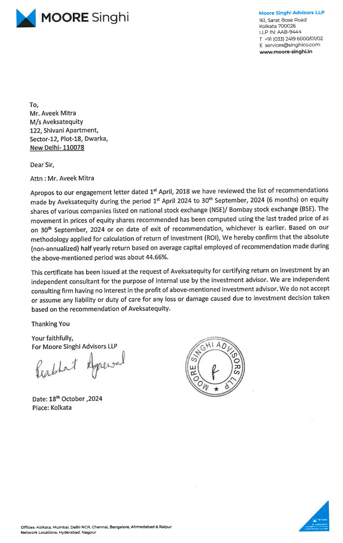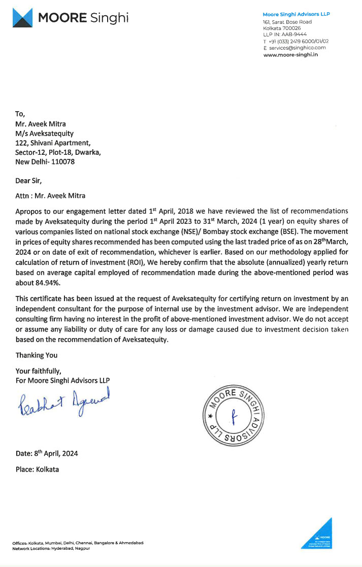 It is declared and stated aveksatequity.com or aveksatequity.in or Aveek Mitra or anyone directly associated with him have taken due care and caution in compilation of data for its web site. However, aveksatequity.com or aveksatequity.in or Aveek Mitra or anyone directly associated with him not guarantee the accuracy, adequacy or completeness of any information and is not responsible for any errors or omissions or for the results obtained from the use of such information of the site. Also, aveksatequity.com or aveksatequity.in or Aveek Mitra or anyone directly associated with him especially states that they have individually, jointly or severally have no financial liability whatsoever to any user on account of the use of information provided on its website.